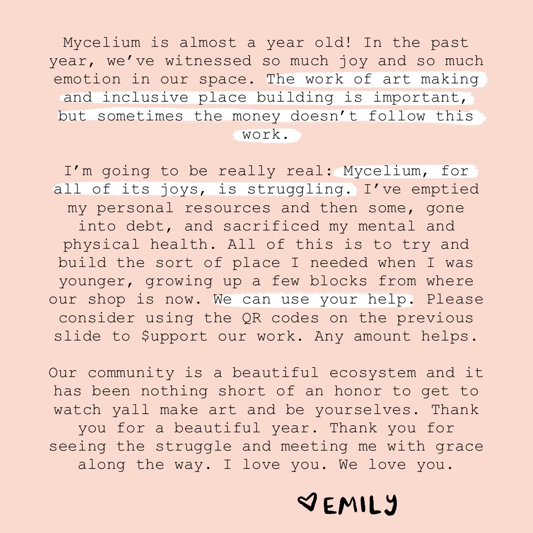 While I was gone, Mycelium went through a portal without me: Our brick and mortar turned one year old. WE DID IT. WE MADE IT. With a new year comes renewed focus. We’re expanding our makers space area to accommodate more classes. (Sorry in advance for the mess this week.) We’re updating the website to start putting ALL of our inventory online. We’re asking our community questions about what yall need from us. Feel free to reply here and let me know. While the future is still (very) scary, and certainly (very) uncertain, we’re building momentum for another year of this Gemini whirlwind of a business, and we can’t wait to make art with you.